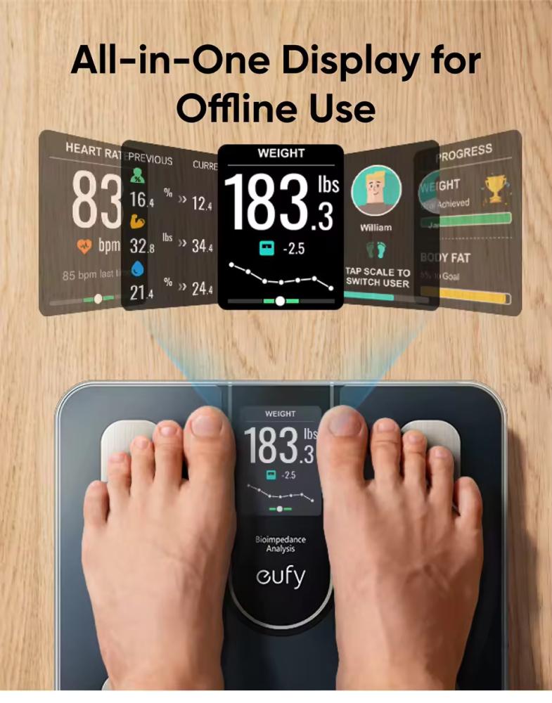 - تحليل كامل للجسم : الوزن القياسي ، كتلة الجسم ، وزن الجسم منزوع الدهن ، نسبة الدهون في الجسم ، النسبة المئوية للماء ، وزن الجسم ، معدل الأيض الأساسي (BMR) ، الدهون الحشوية ، نسبة البروتين ، كتلة العظام.